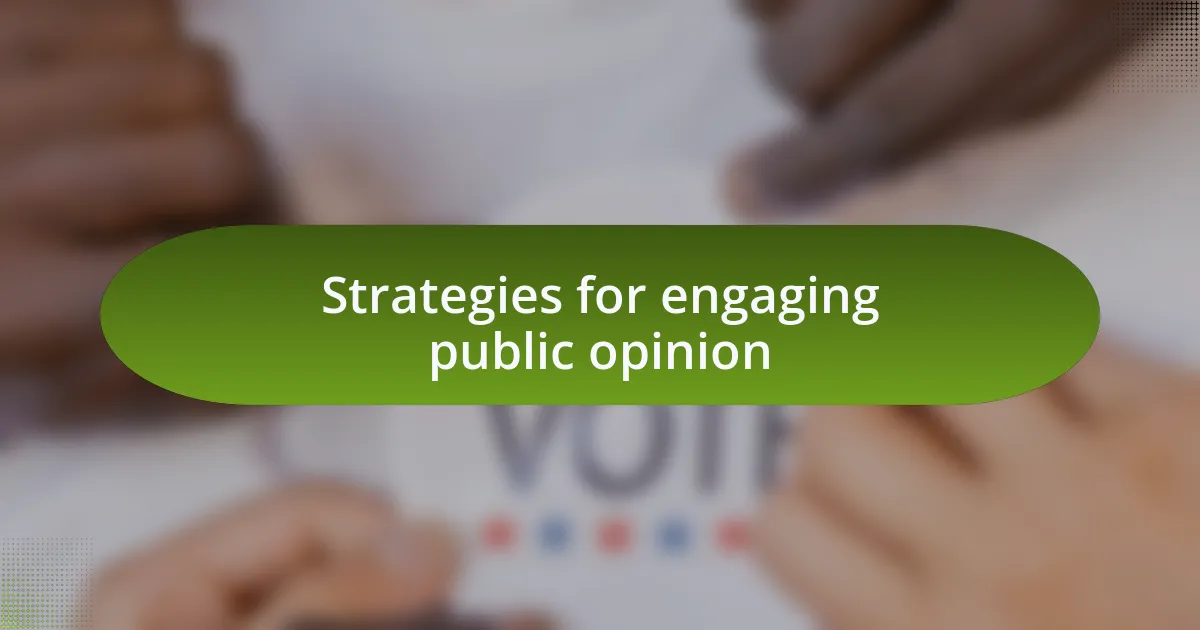 Engaging public opinion requires a multifaceted approach. I remember attending a town hall where a local leader invited community members to share their thoughts on a new policy. That open dialogue fostered a sense of belonging and empowerment among attendees. Have you ever noticed how being invited to voice your opinion can ignite a passion for participating in political discourse?